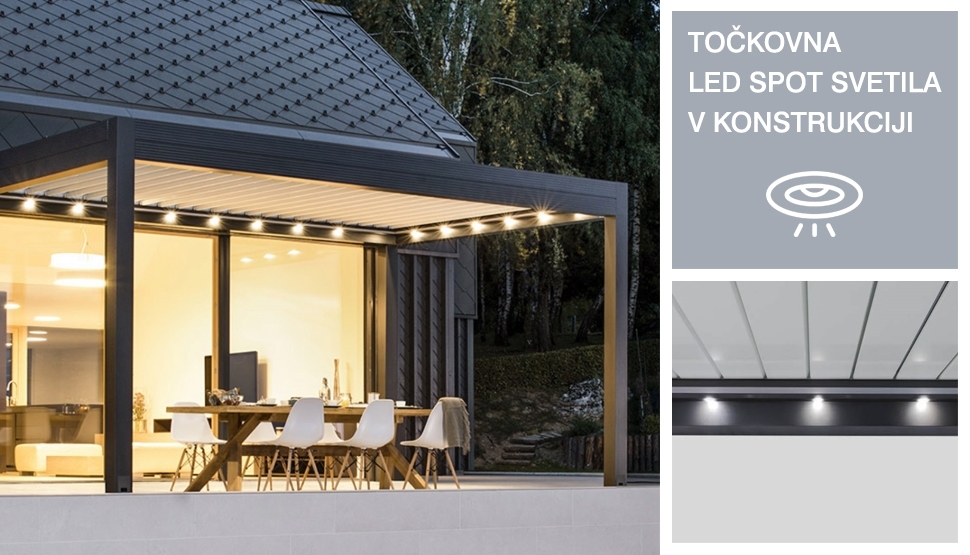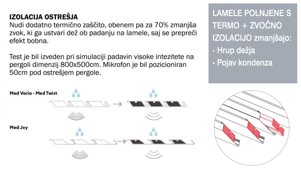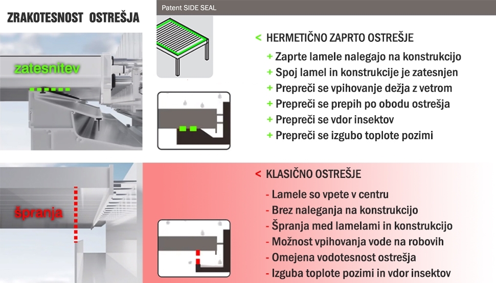 ➤ SIDE SEAL® patentirano tesnenje med zaprtimi lamelami in konstrukcijo pergole.