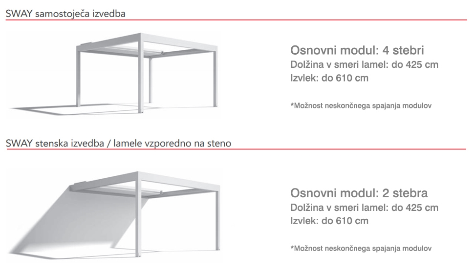 Bioklimatska pergola SWAY je bioklimatska pergola z zložljivim lamelnim ostrešjem. Lamele se s pantografskim mehanizmom hkrati nagibajo in zlagajo, ostreše pa je vodotesno in zrakotesno zaprto.