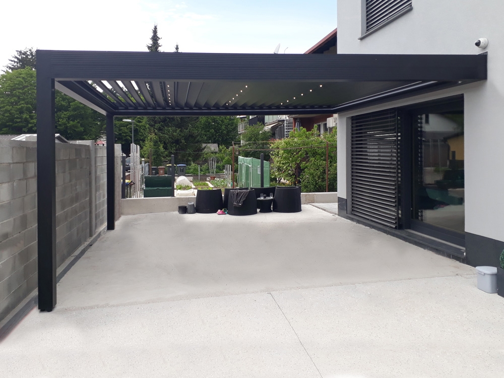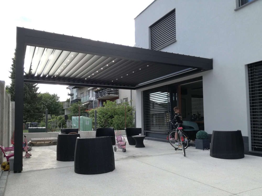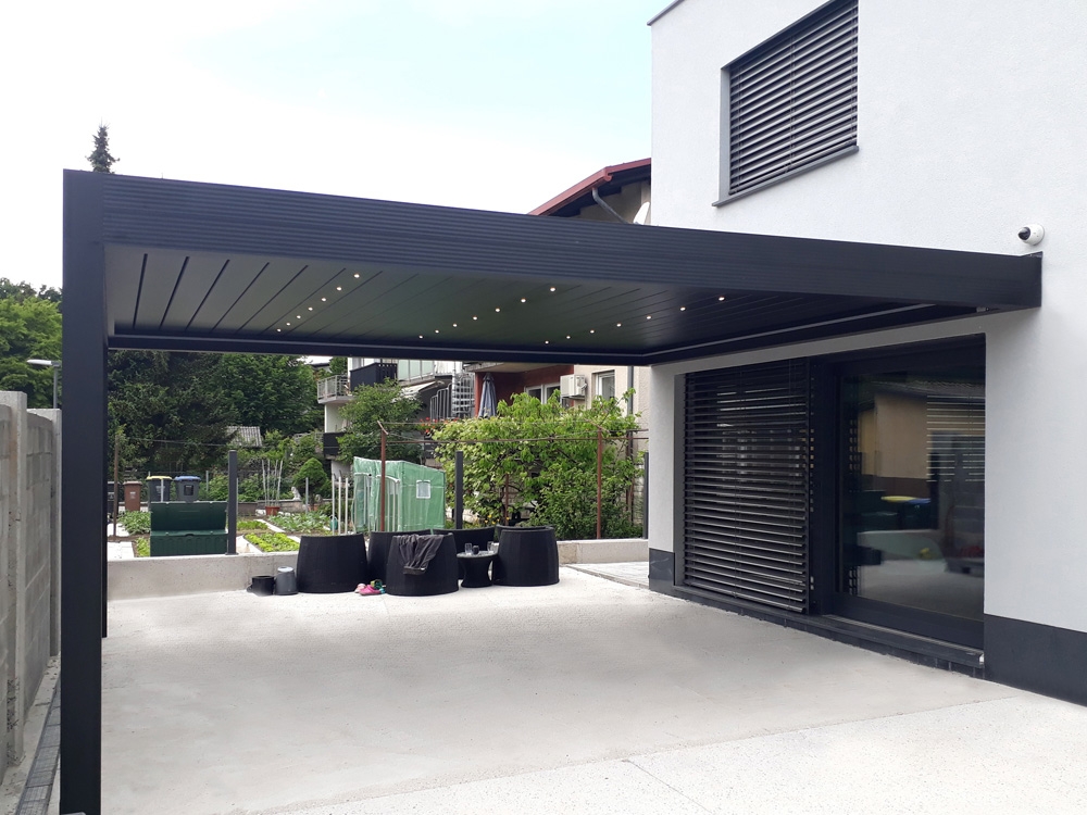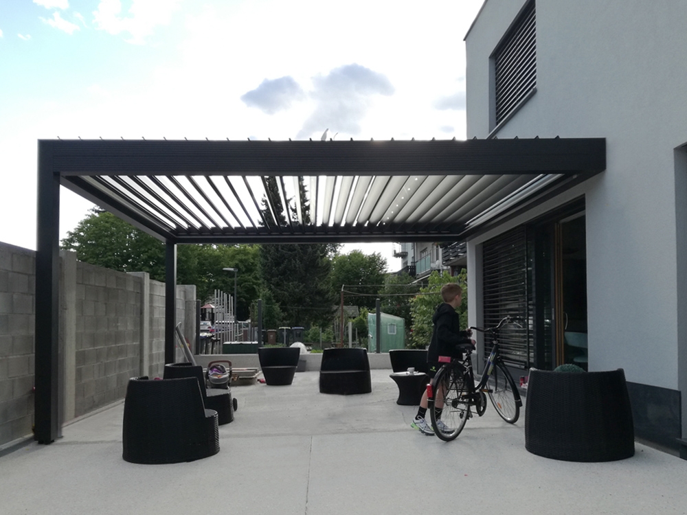 Bioklimatska pergola TWIST na terasi moderne družinske hiše v Ljubljani.