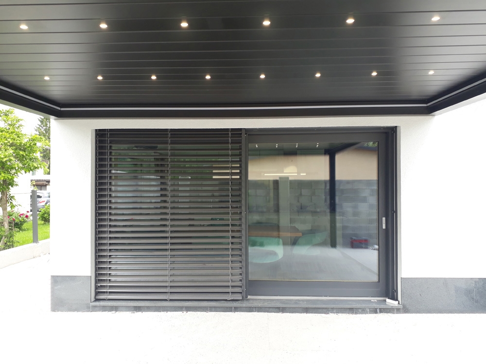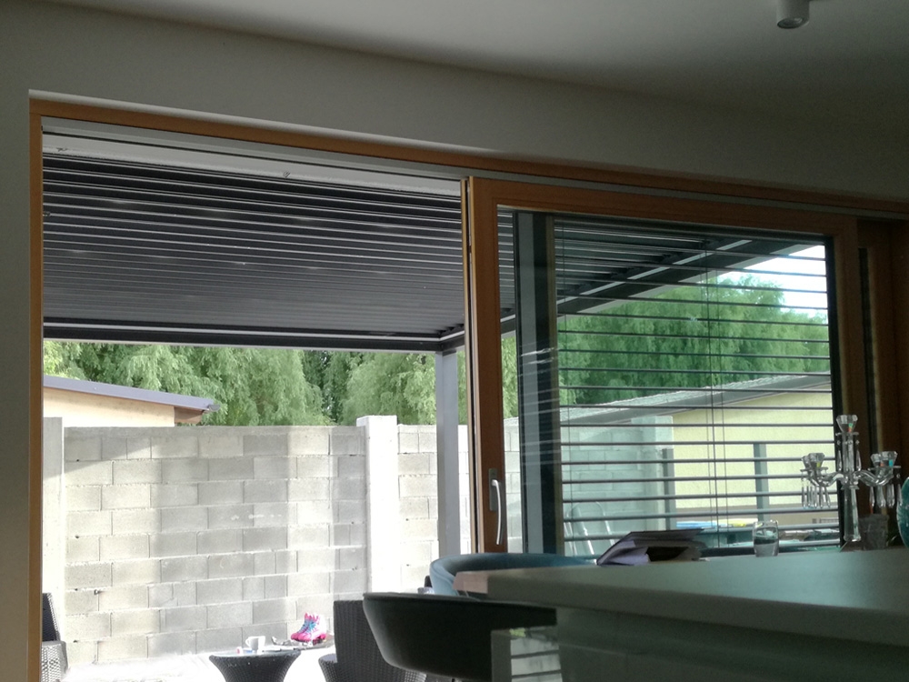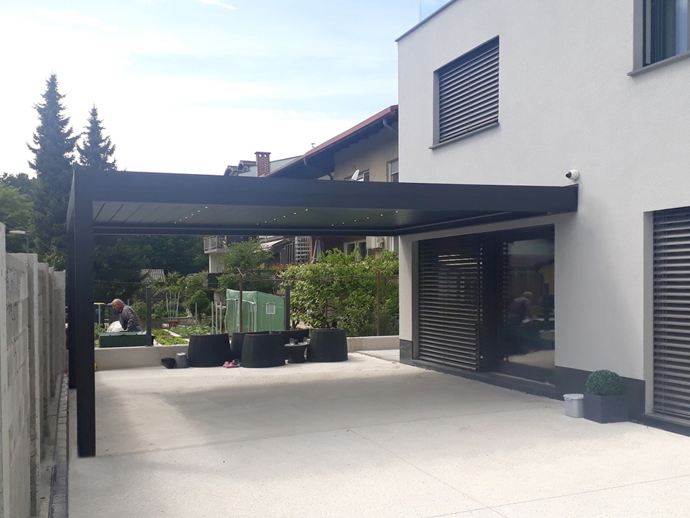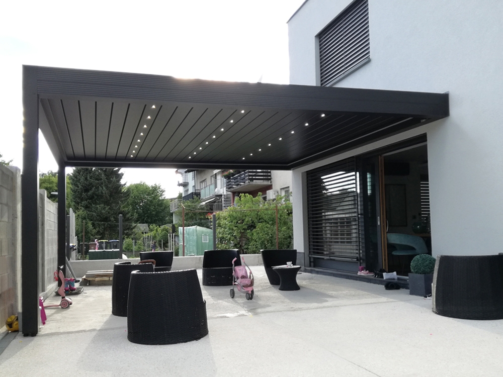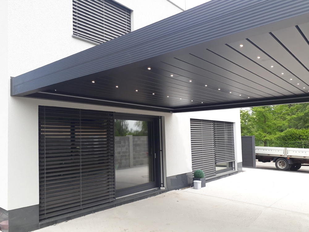 Bioklimatska pergola TWIST na terasi moderne družinske hiše v Ljubljani.
