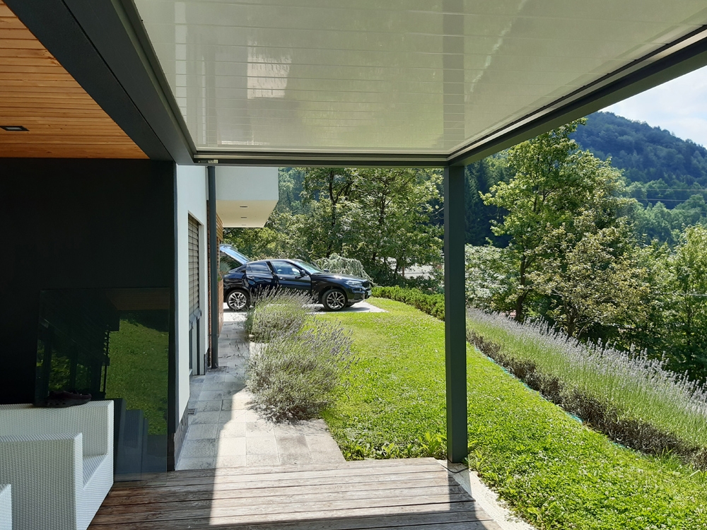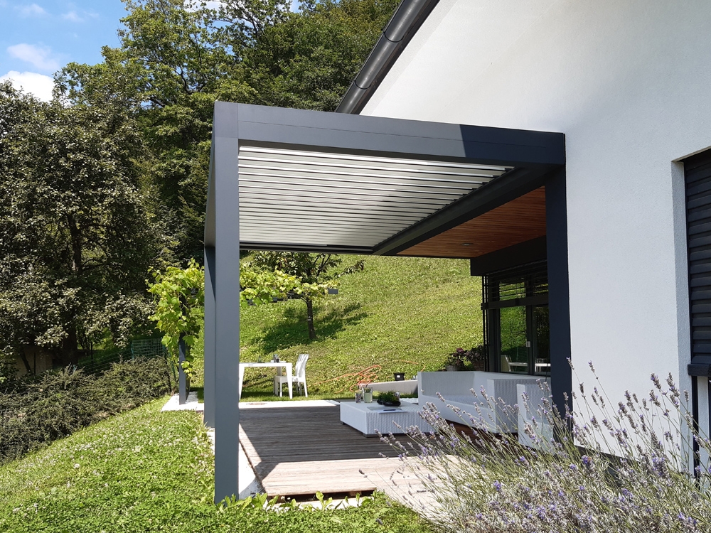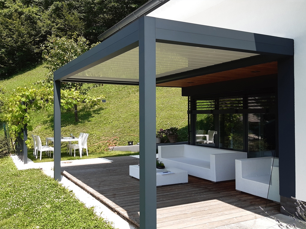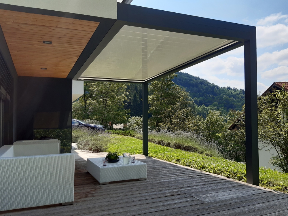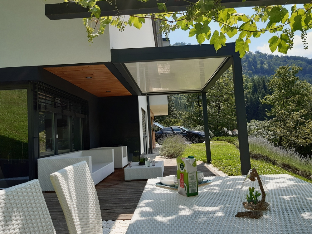 Bioklimatska pergola JOY na terasi družinske hiše v Idriji.