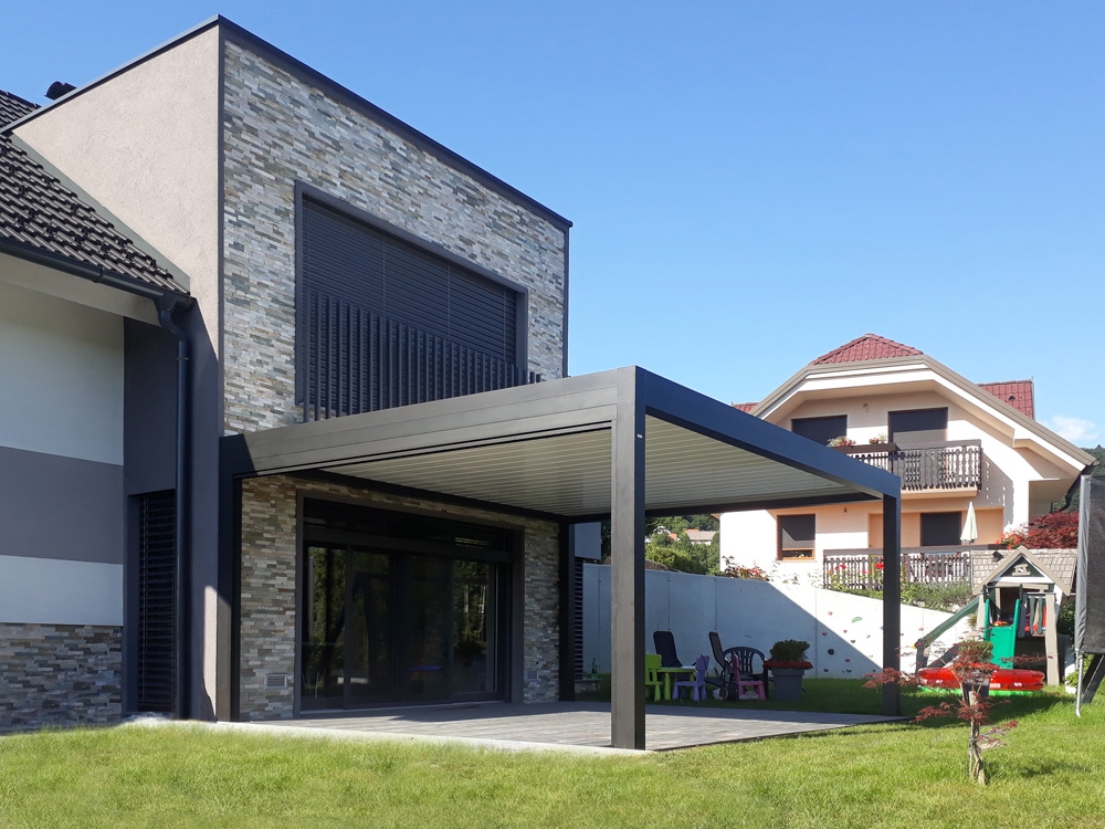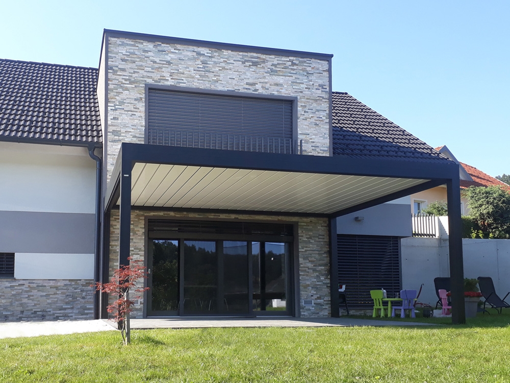 Bioklimatska pergola JOY na terasi družinske hiše v okolici Ljubljane.