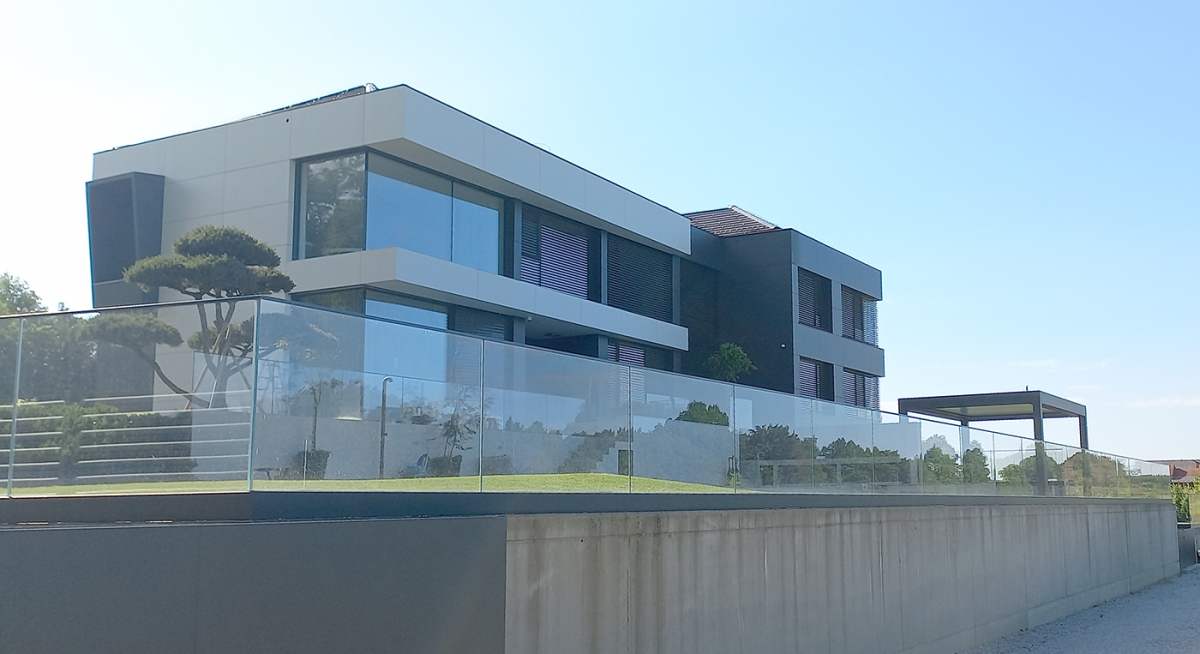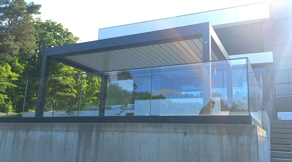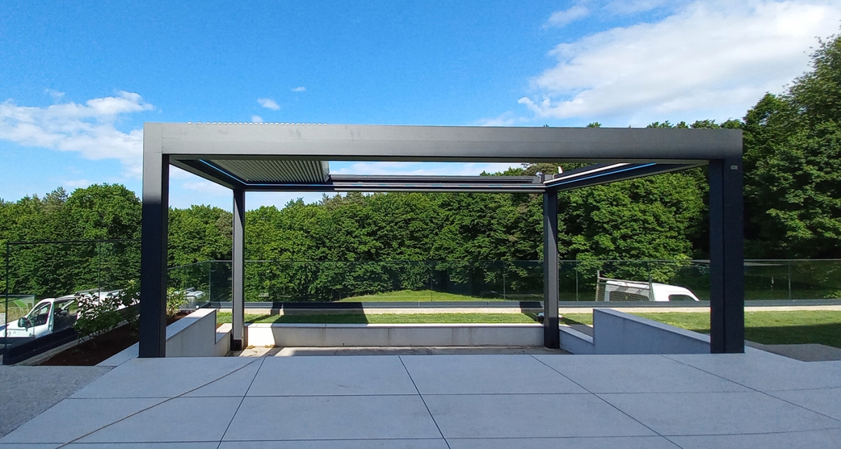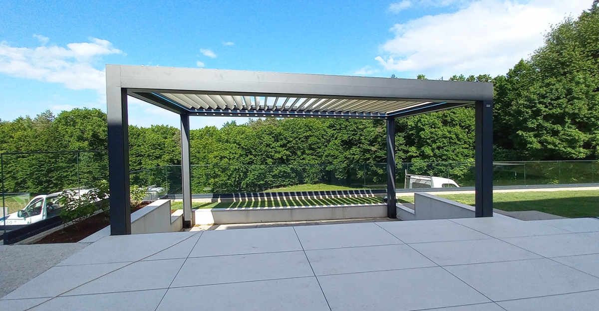 Bioklimatska pergola VELVET PLUS na terasi moderne družinske vile v okolici Ormoža.