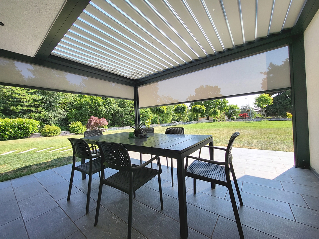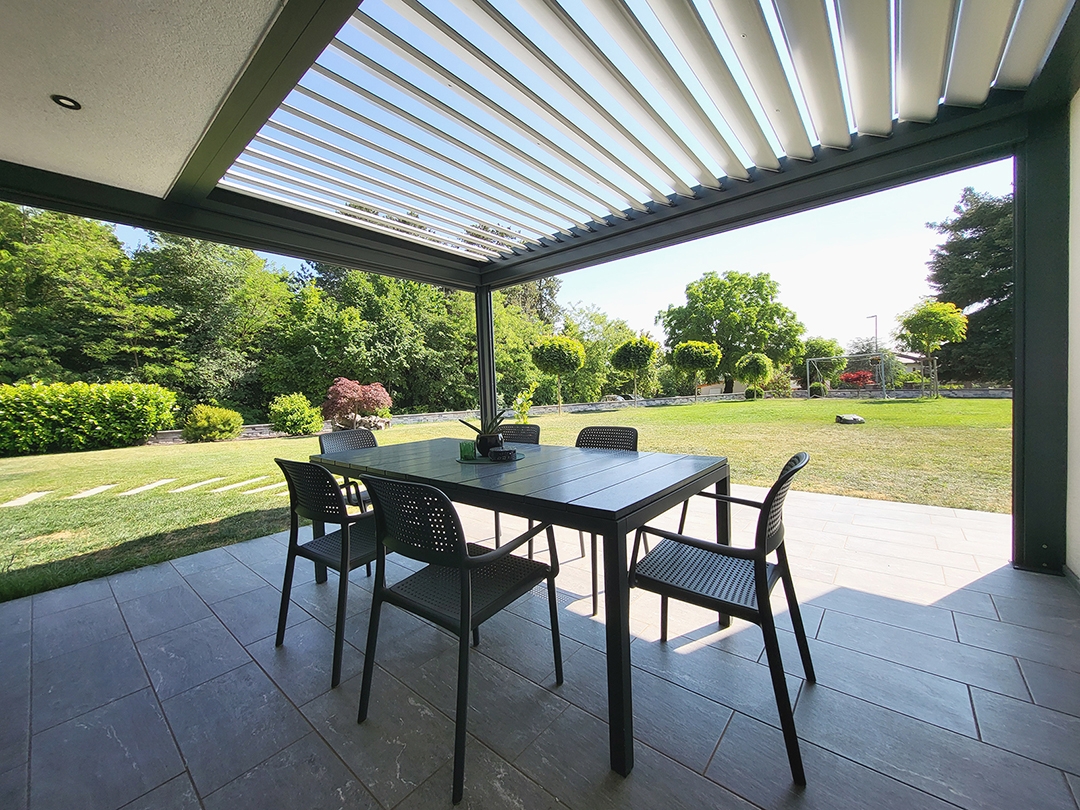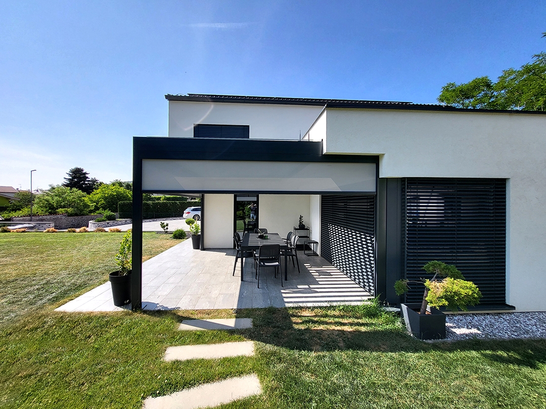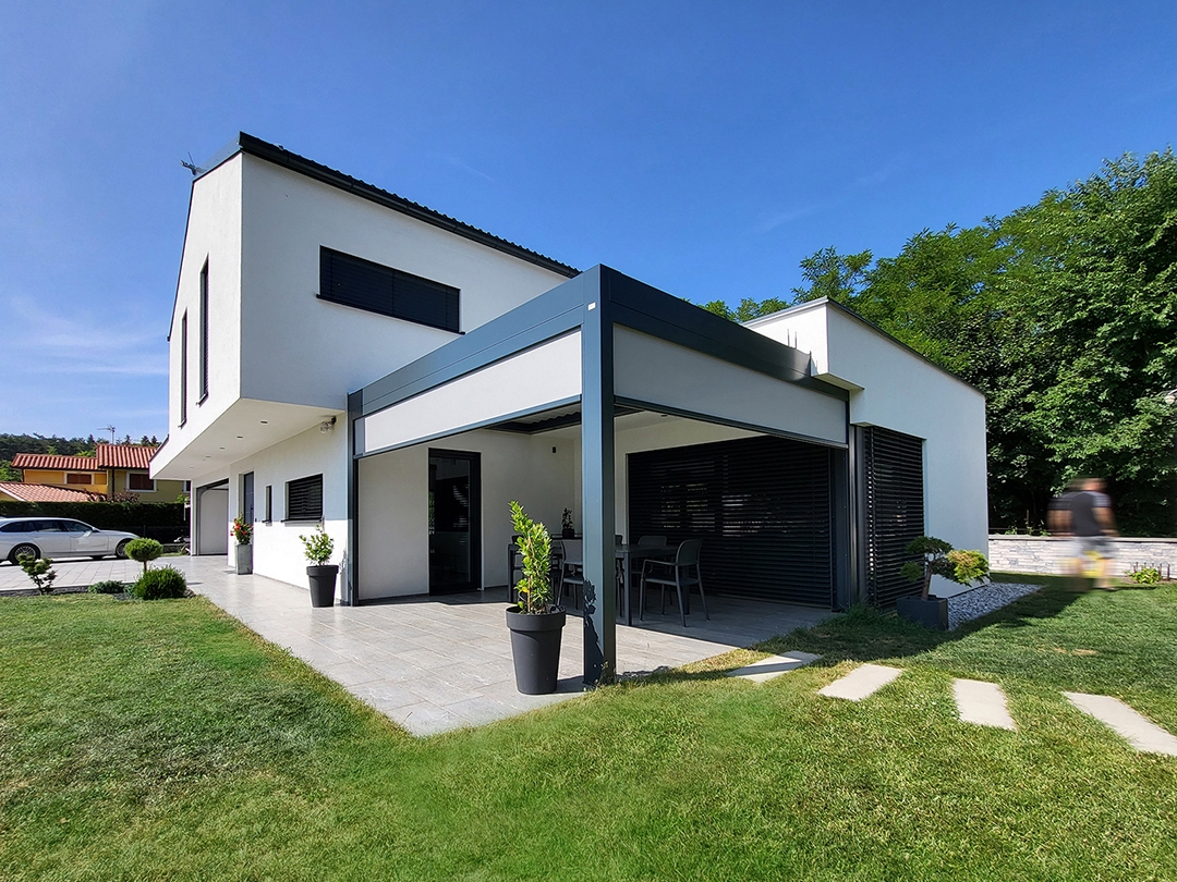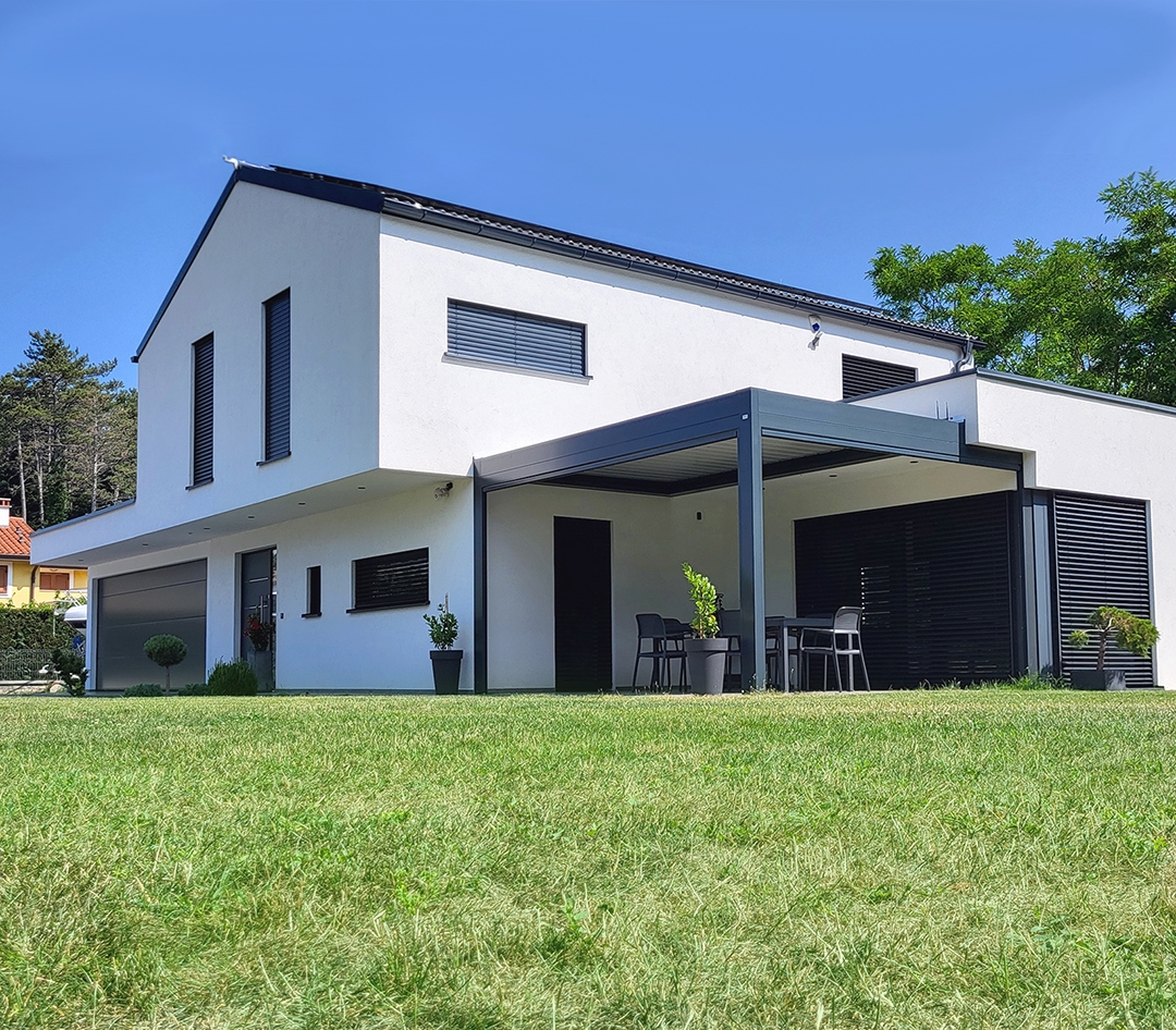 Bioklimatska pergola BASIC-XL na terasi družinske hiše v Kozini.
