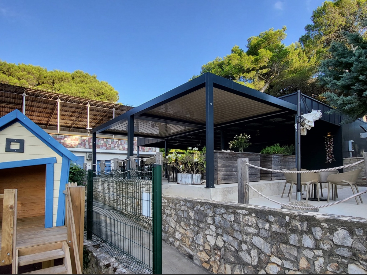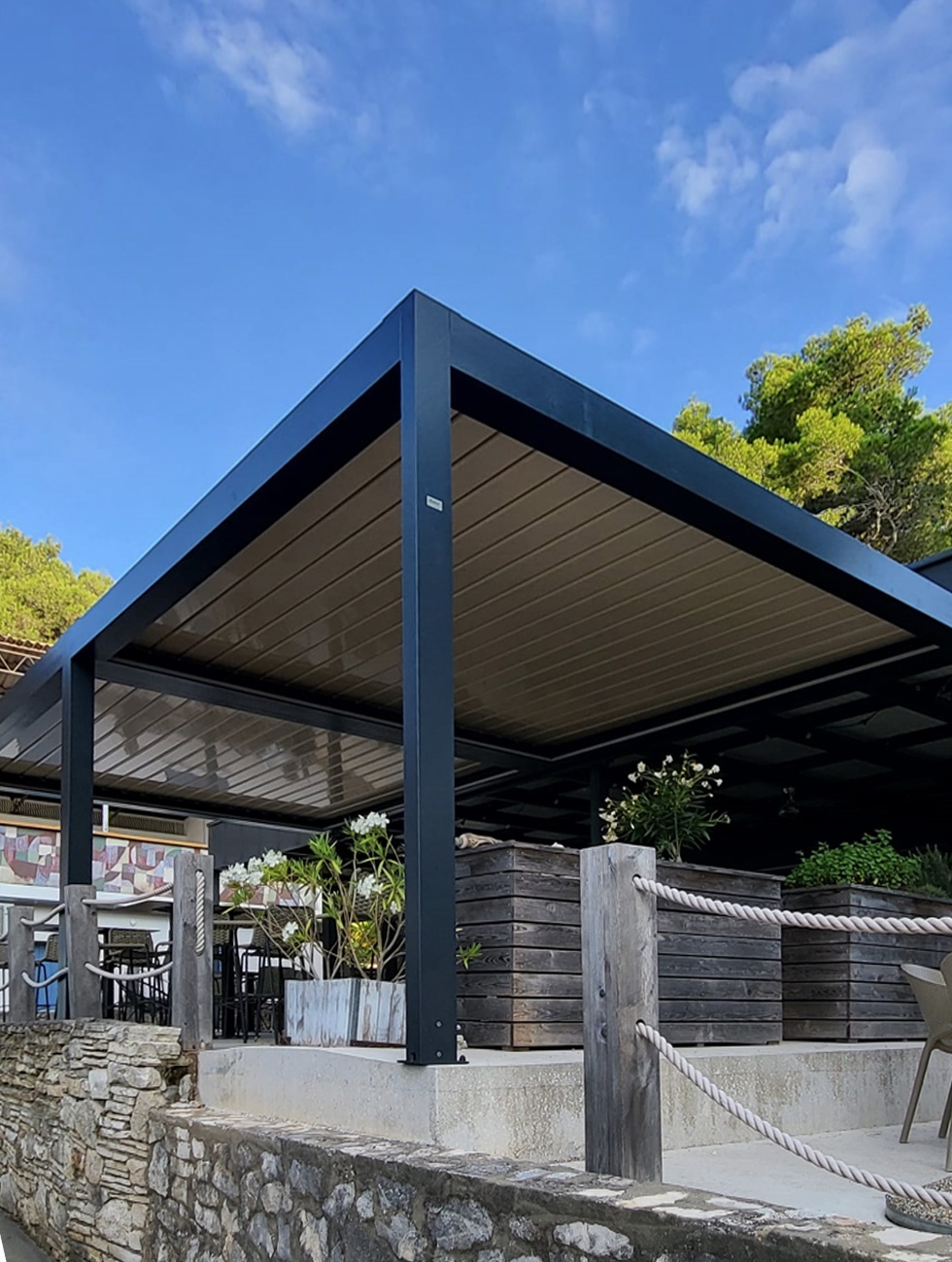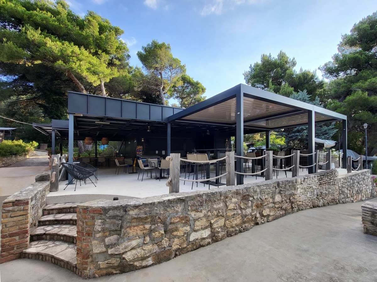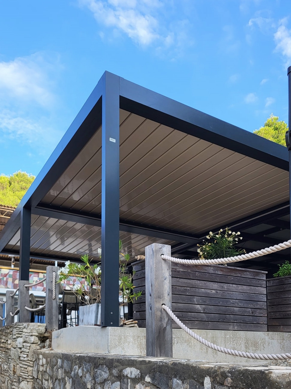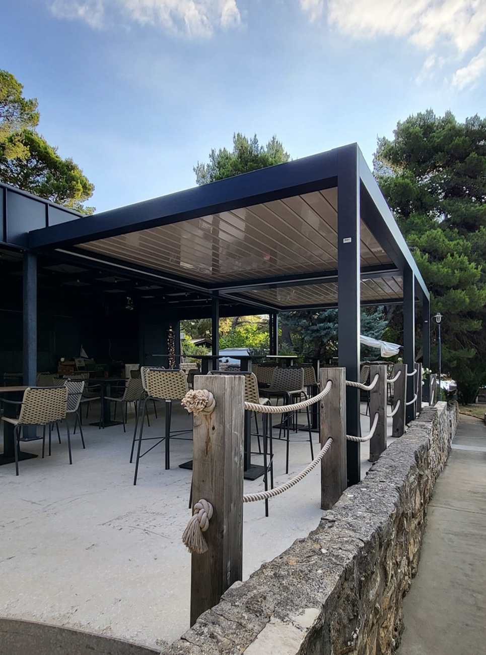 Bioklimatske pergole BASIC-XL na terasi gostinske terase - Kranjski Kamp Premantura.